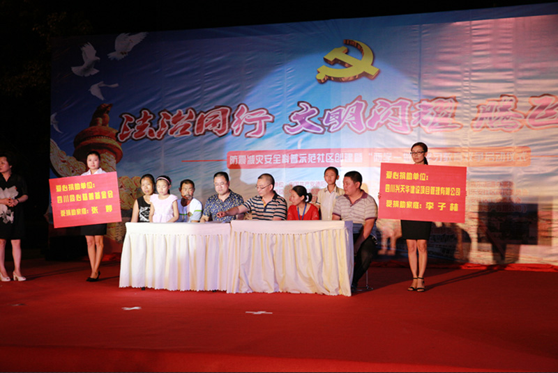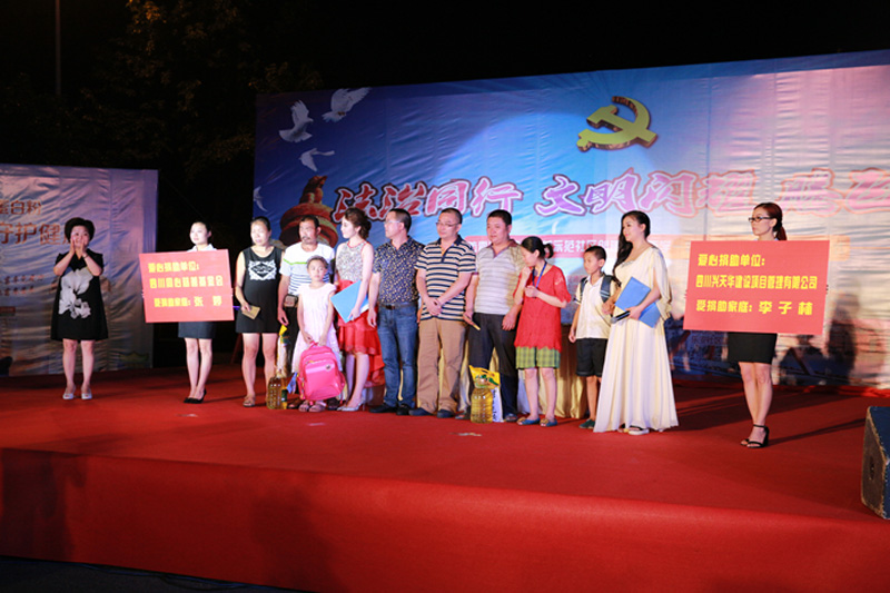 2016年6月21日晚上八点,伴随着热情的女声合唱,2016年乐安社区以“法制同行,文明闪耀,腾飞旌东”为主题的文娱活动在德阳市旌阳区旌东街道珠江桥头东段正式开始。洋溢着热情的节目接踵而至。同时,四川同心慈善基金会及四川兴天华建设项目管理有限公司也为德阳市旌阳区旌东街办乐安社区李子林和张婷两位同学带来了温暖的问候。
