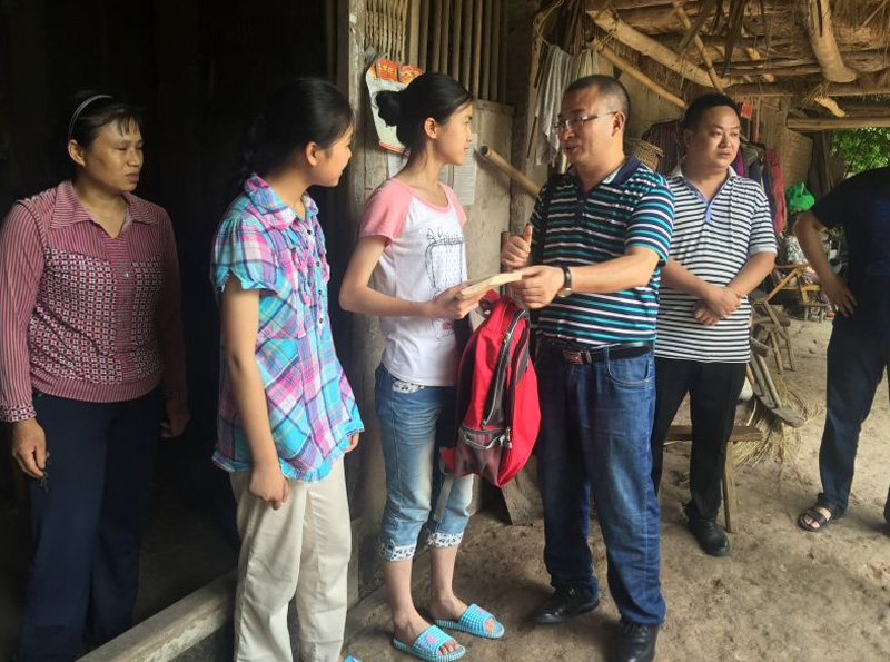 理事长罗钢为廖宇杰、廖宇湘送上基金会捐赠的助学金2万元及书包,油米等