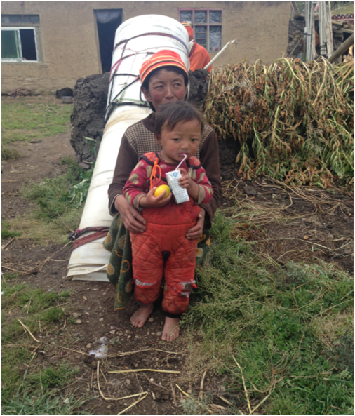 经过十几分钟的车程我们来到了第二户贫困家庭——拥拉的家,拥拉家常住人口6人,拥拉育有6子女,与丈夫离异后独自带着其中3个孩子回到了娘家,本来娘家就很穷,现在拥拉带着3个年幼的孩子回家无疑为这个贫困的家庭带来更大的经济压力。在严寒的天气里,孩子仍赤脚踩在地上,破旧的家是用牛粪堆砌的栅栏。虽然我们不懂彼此的语言,但是我们用眼神也能够感受到彼此的热情,我们的心是在一起的。基金会为这个家庭送去了慰问品及慰问金,志愿者也纷纷慷慨解囊,送上了自己的爱心善款,也有志愿者从包里拿出了糖果与年幼的孩子一起分享。