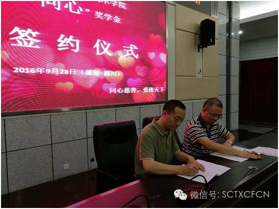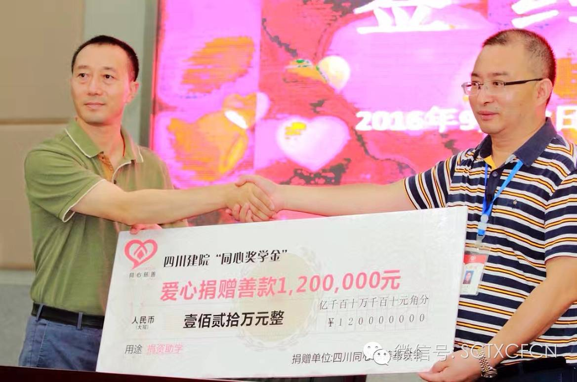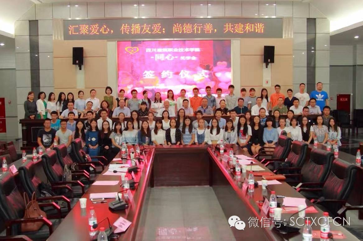 2016年9月28日上午10点,在四川建筑职业技术学院建校60周年即将来临之际,四川同心慈善基金会为全院学子献上浓浓爱意--四川建院“同心奖学金”签约仪式圆满举行。首期“同心奖学金”120万元,由四川同心慈善基金会携手四川科特建设管理有限公司、四川兴天华建设项目管理有限公司、四川开元工程项目管理咨询有限公司、四川利翔建设项目管理有限公司、四川华通建设工程造价管理有限责任公司、四川中创吉达工程咨询有限公司、北京君益致同管理有限公司及四川省名扬建设工程管理有限公司等八家工程造价咨询企业共同捐赠,其中四川科特和四川兴天华各出资30万元,其余六家单位各出资10万元。