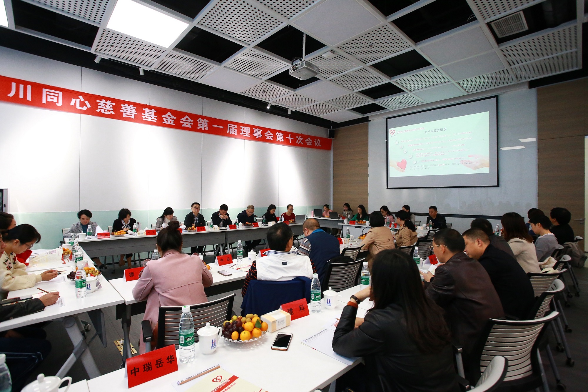 10月31日,四川同心慈善基金会第一届理事会第十次会议在四川华通会议室召开。理事长罗钢、执行理事长张钊、监事长刘戟、副理事长潘敏、刘萍、杨荣凤、秘书长王卫东和理事、监事及主要捐赠单位代表等共49人参加本次会议。本次会议由执行理事长张钊主持。