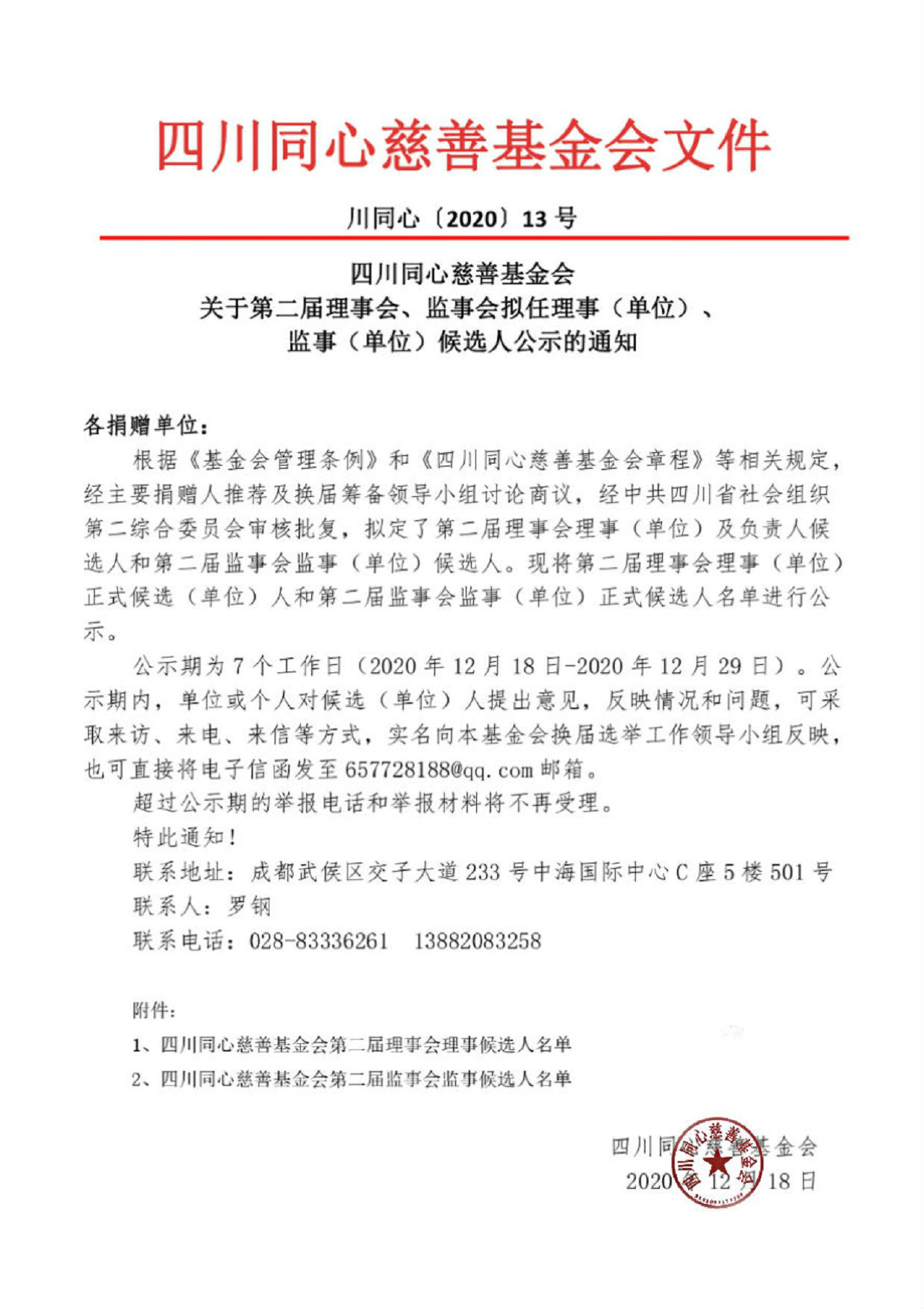 川同心〔2020〕13号 关于第二届理事会、监事会拟任理事、监事候选人公示的通知